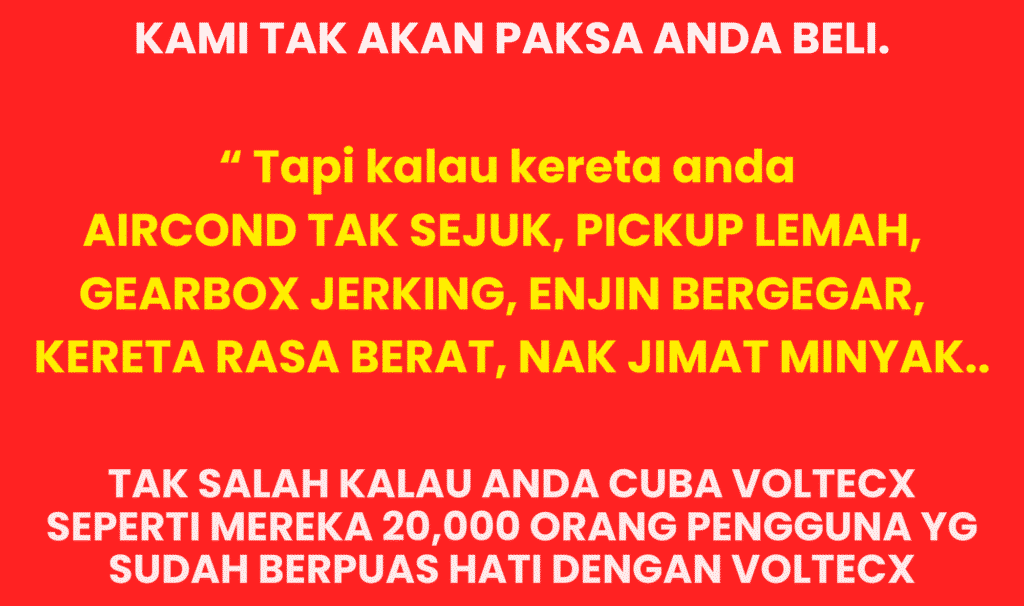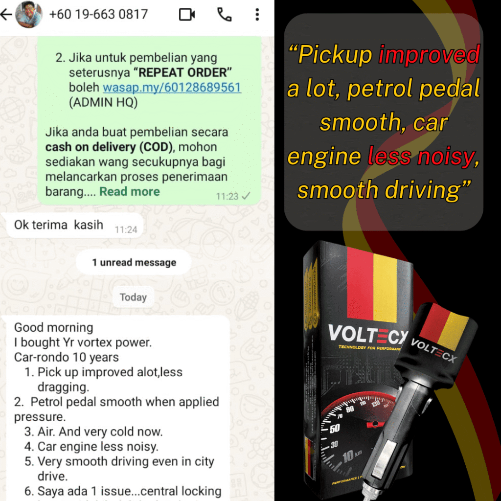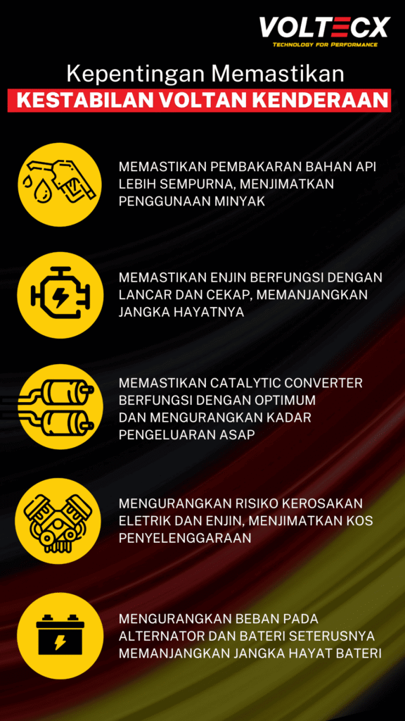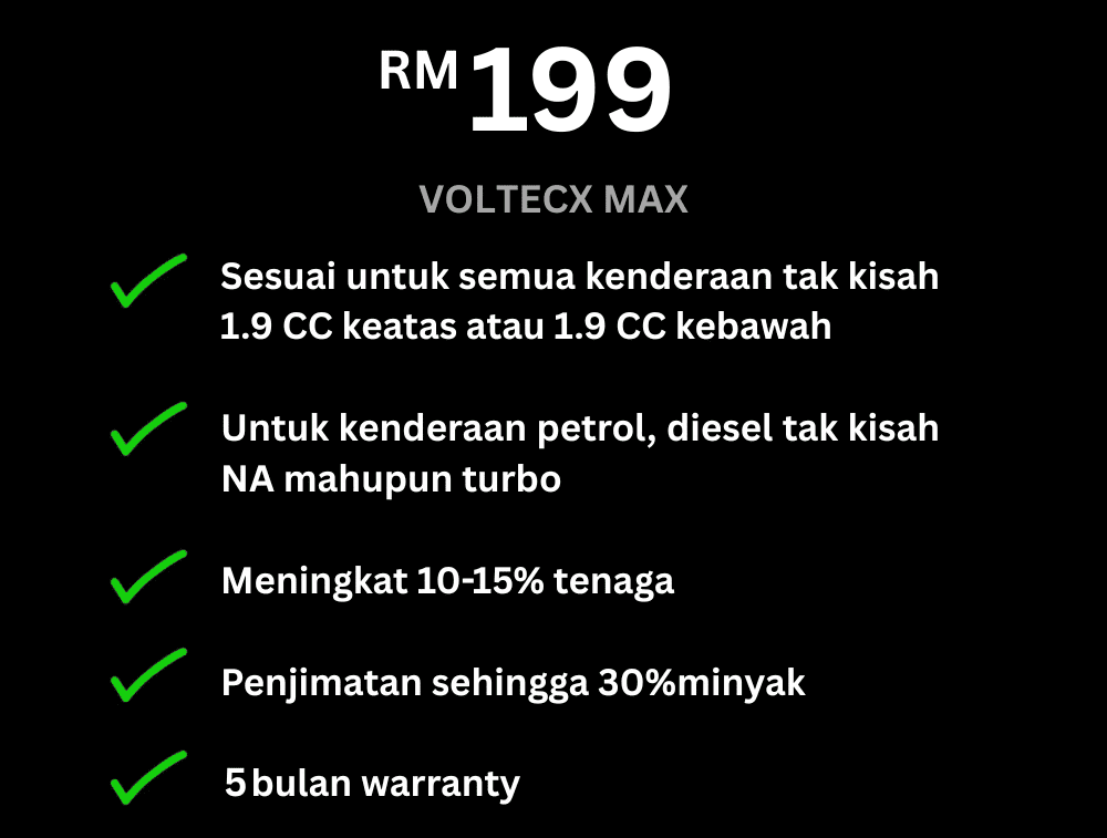 Voltecx membantu menstabilkan aliran elektrik dalam kenderaan, menjadikan sistem pembakaran lebih efisien. Bila enjin berjalan lebih lancar, penggunaan minyak pun jadi lebih jimat.